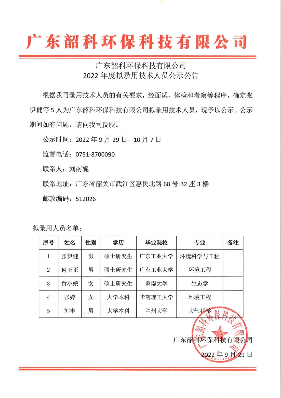 根據(jù)我司錄用技術(shù)人員的有關(guān)要求,經(jīng)面試、體檢和考察等程序,確定張伊健等5人為廣東韶科環(huán)??萍加邢薰緮M錄用技術(shù)人員,現(xiàn)予以公示。公示期間如有問題,請(qǐng)向我司反映。