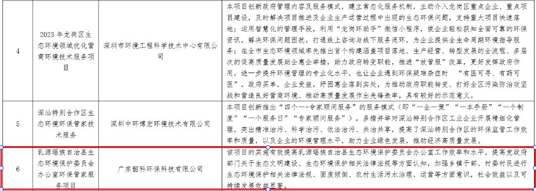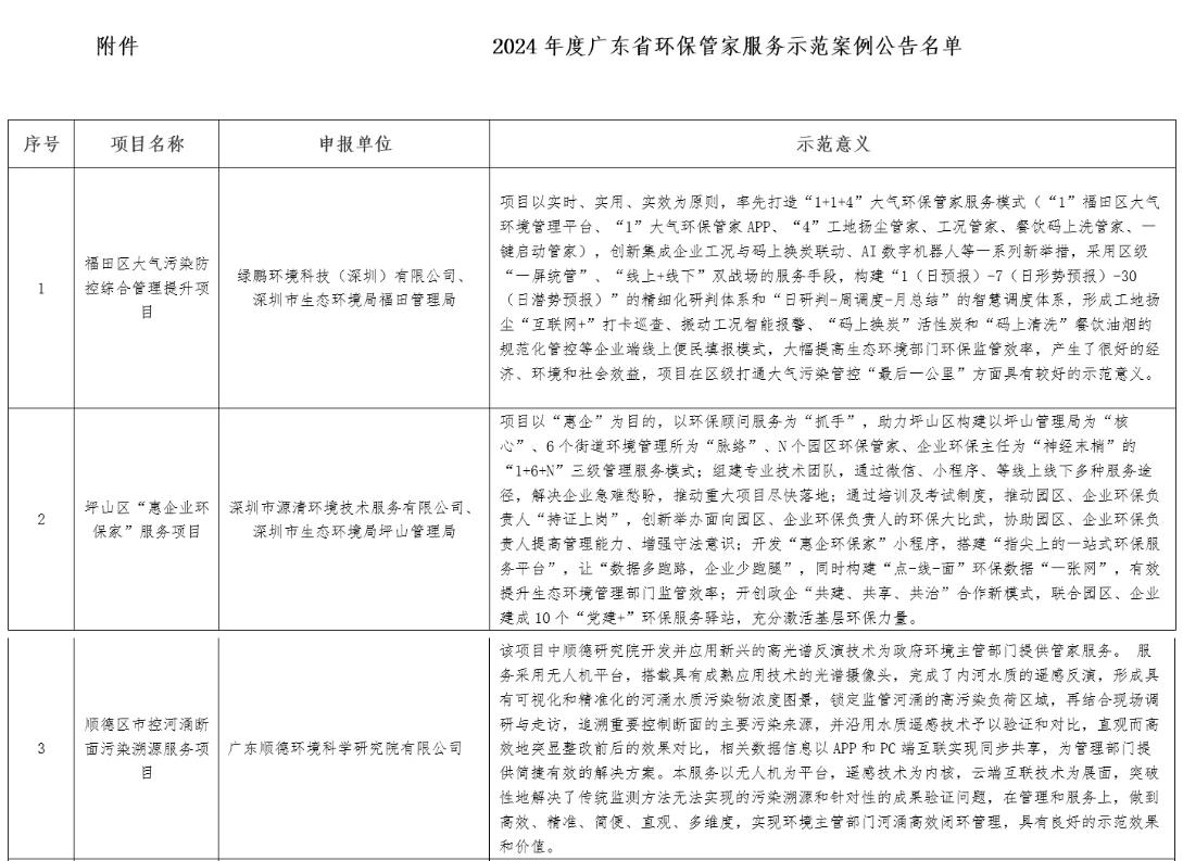 近日,廣東省環(huán)境保護(hù)產(chǎn)業(yè)協(xié)會(huì)公布了“2024年度廣東省環(huán)保管家服務(wù)示范案例”名單,我司承接的“乳源瑤族自治縣生態(tài)環(huán)境保護(hù)委員會(huì)辦公室環(huán)保管家服務(wù)項(xiàng)目”成功入選。